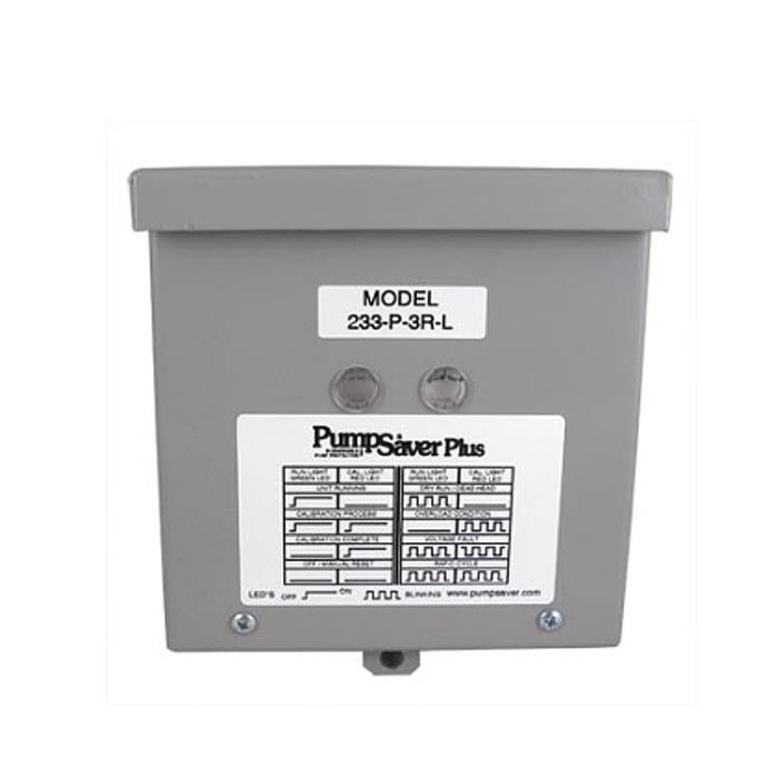 Metal NEMA-3R electrical box with lenses for viewing the single-phase pump protection relay status lights
