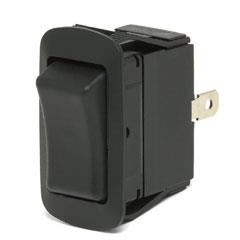 25A at 12V DC. These general purpose switches are suitable for many kinds of applications. They are weather-resistant with contact areas sealed to IP66 (high pressure wash resistant). Switches snap into standard rocker switch holes 1.45" x 0.08" (36.8 x 21.1mm) in panels from 0.09" to 0.19" thick (2.4 x 4.7mm). They have silver contacts, which give superior switching performance. Housing is matte black.