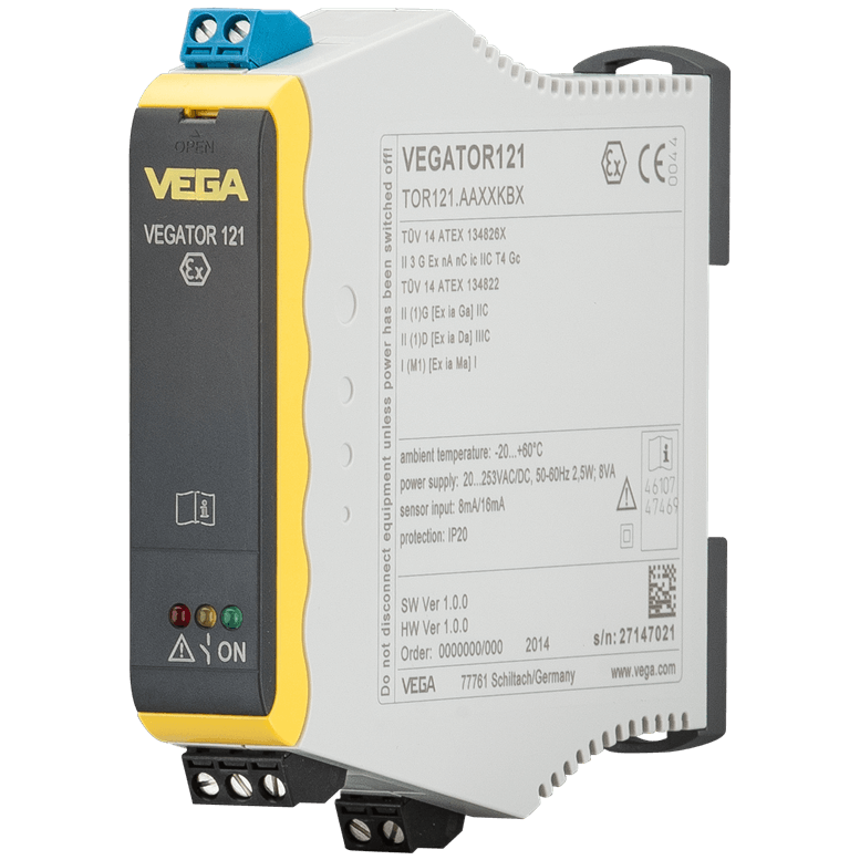The VEGATOR 121 is a signal conditioning instrument for point level detection with the vibrating level switches VEGASWING, VEGAVIB and VEGAWAVE with electronics version "Two-wire 8/16 mA".