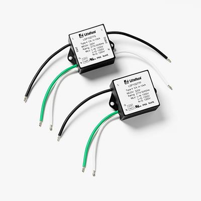 Littelfuse LSP10 Surge Protection Modules provide transient overvoltage protection for outdoor and commercial LED lighting fixtures. Constructed with Littelfuse thermally protected Varistors, they provide robust surge current handling capability. A built-in thermal disconnect function provides additional protection from catastrophic failures and fire hazards, even under the extreme circumstances of Varistor end of life or sustained overvoltage conditions. The LSP10 is available with either parallel or series connections. With the parallel-connected version, an indicator wire can activate an LED to tell maintenance personnel when to replace the SPD in order to ensure the luminaire remains protected. The series-connected version cuts luminaire power off to provide a clearly visible indication the SPD should be replaced.